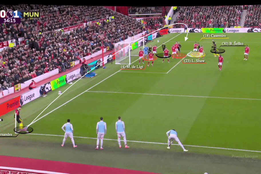 曼联的有些定位球没啥特别套路,就是简单的传中到位,抢点及时,头球出色,马奎尔、卡塞米罗、德里赫特和谢什科等头球出色的球员功不可没,负责主罚的通常是布鲁诺·费尔南德斯右脚主罚左侧角球,姆贝莫左脚主罚右侧角球,踢内侧弧线球;任意球则基本由B费包办。